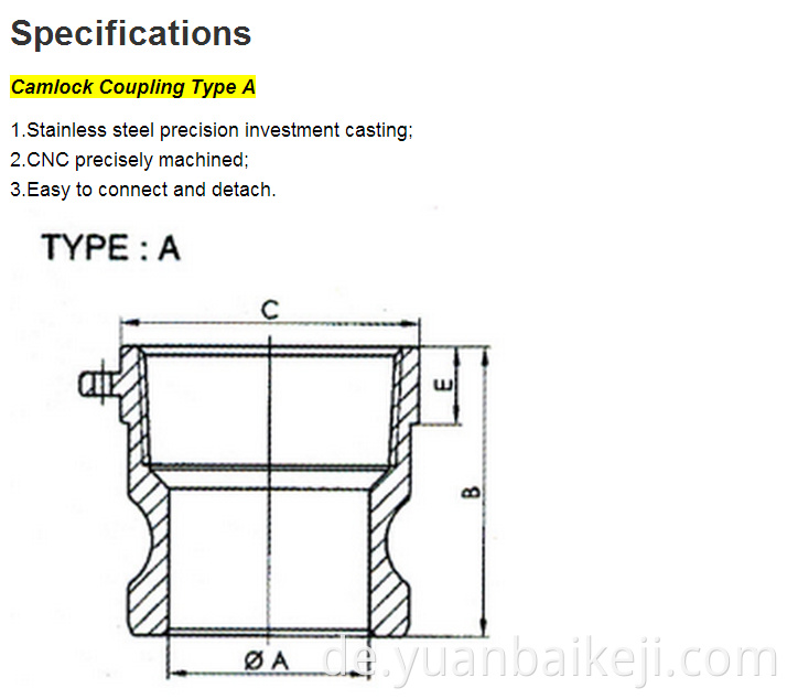 Kurze Beschreibung von Typ A Quick Connector: Geben Sie einen schnellen Anschluss ein männlicher Anschluss, der auf beiden Seiten keine Laschen enthält. Ein Ende des Steckers ist direkt mit den Laschen mit dem weiblichen Anschluss verbunden und das andere Ende ist mit internen Fäden verbunden.
